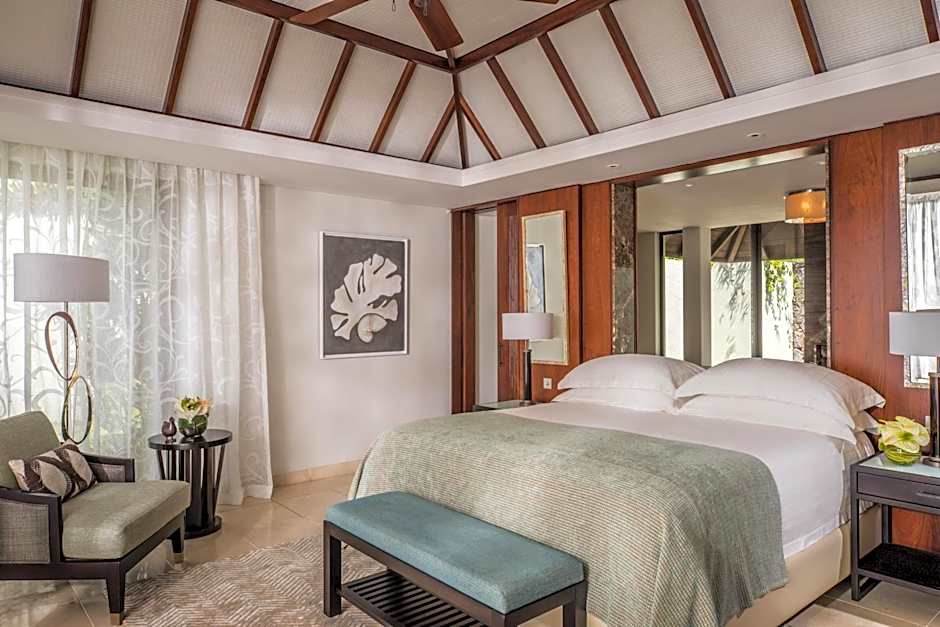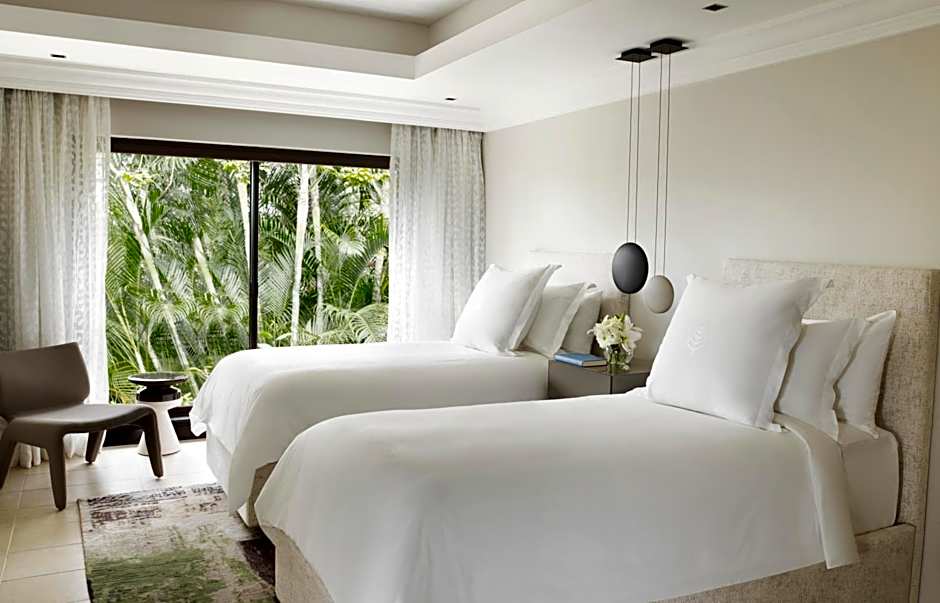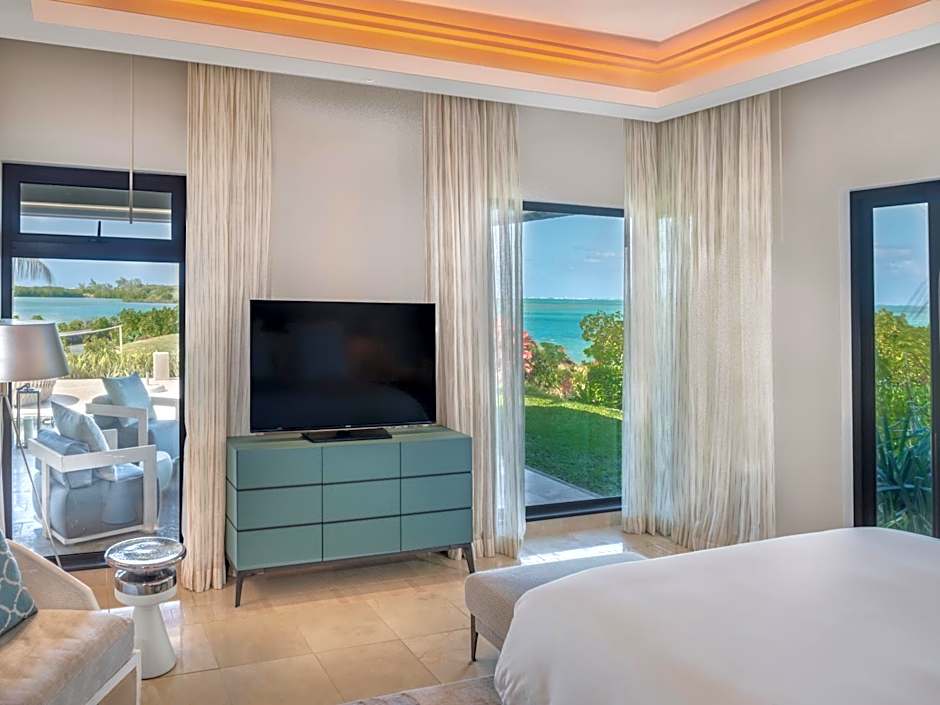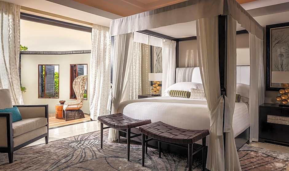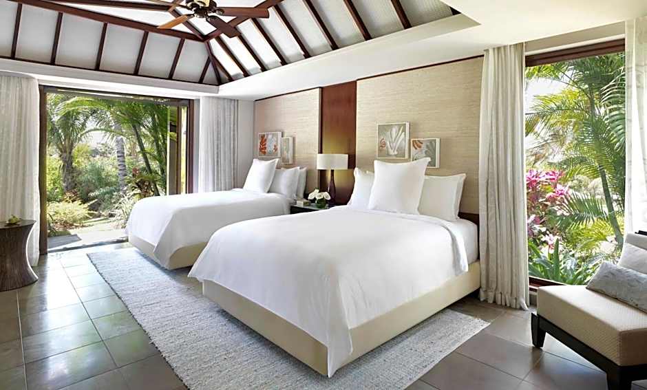 Enjoy the privacy of a secluded peninsula in the Five-Bedroom Grand Residence Villa, along with panoramic views of a lagoon and natural mangrove formations. Three king beds and two twin beds.